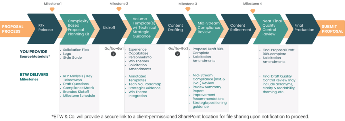 The federal bidding landscape has changed. BTW & Co.’s expert proposal practitioners and strategists built our Bridge the Way™ AI-Powered Proposal Respone Packages to meet the moment in federal contracting. These packages combine the expertise of seasoned proposal professionals with the efficiency of human-led AI workflows, delivering up to 40% productivity gains without sacrificing ethics, quality, or compliance.